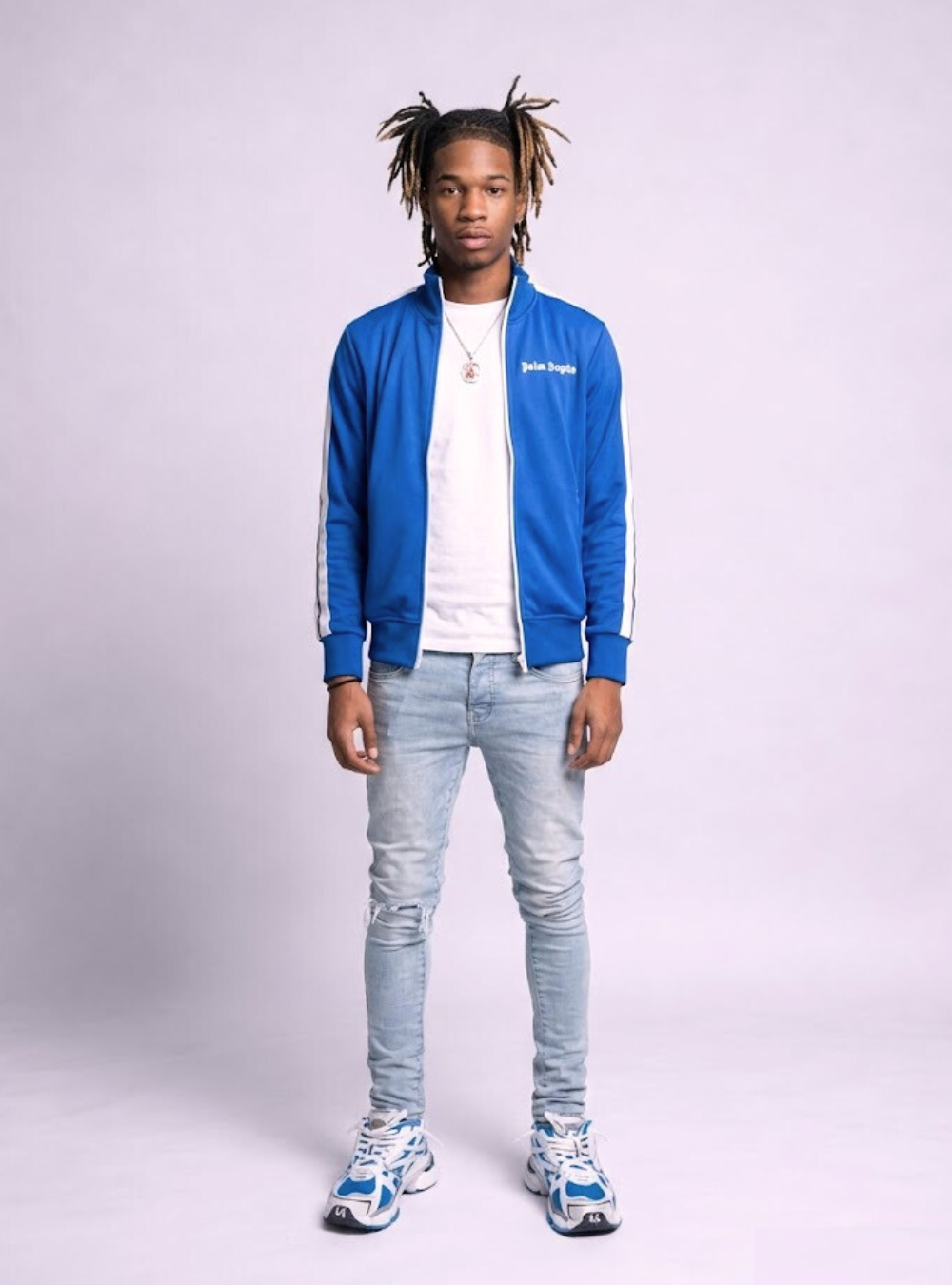 Balenciaga como base de impacto, jaqueta Track Suit Palm Angels em azul profundo e Slim Fit Purple azul claro equilibrando o visual.