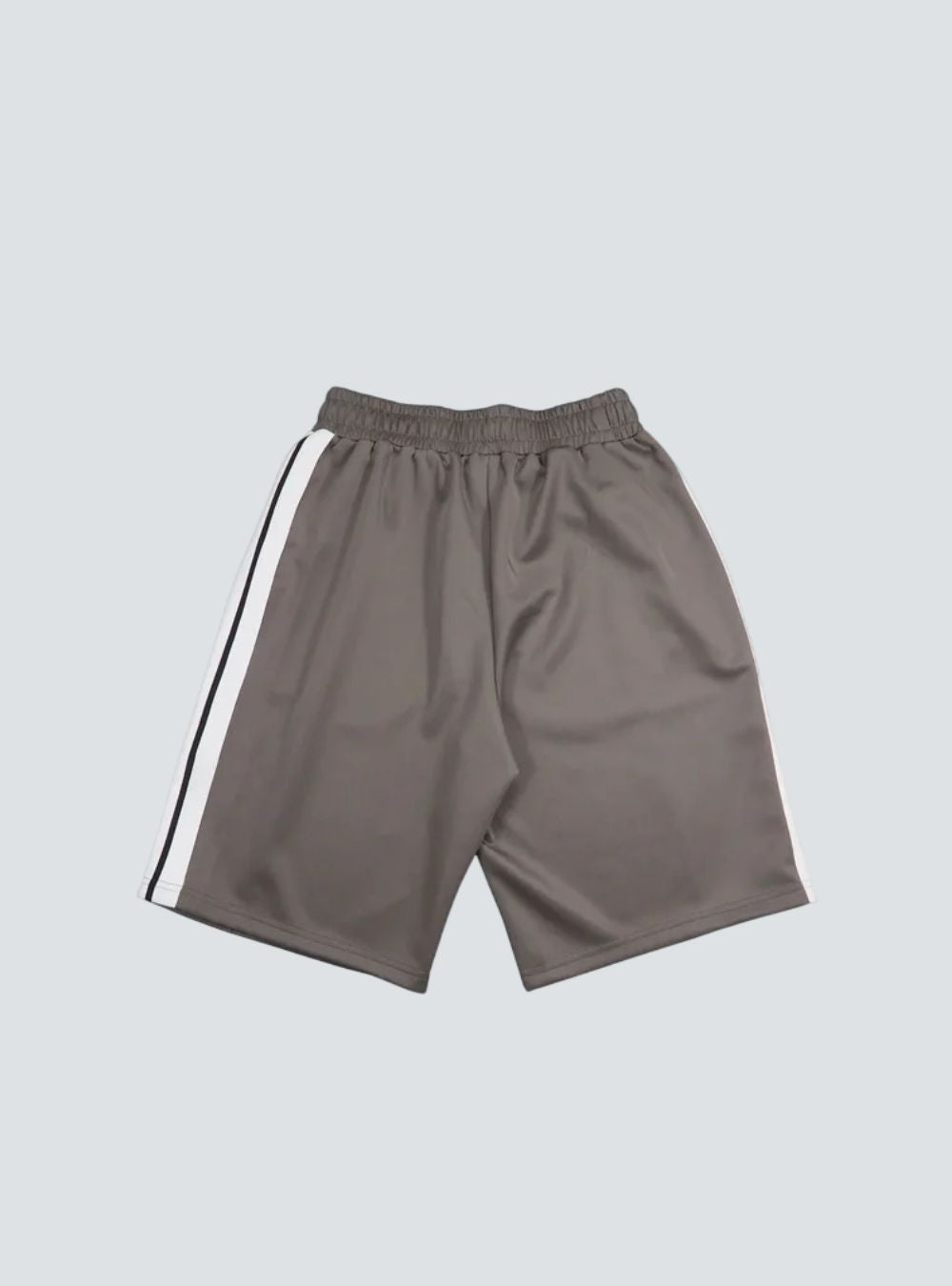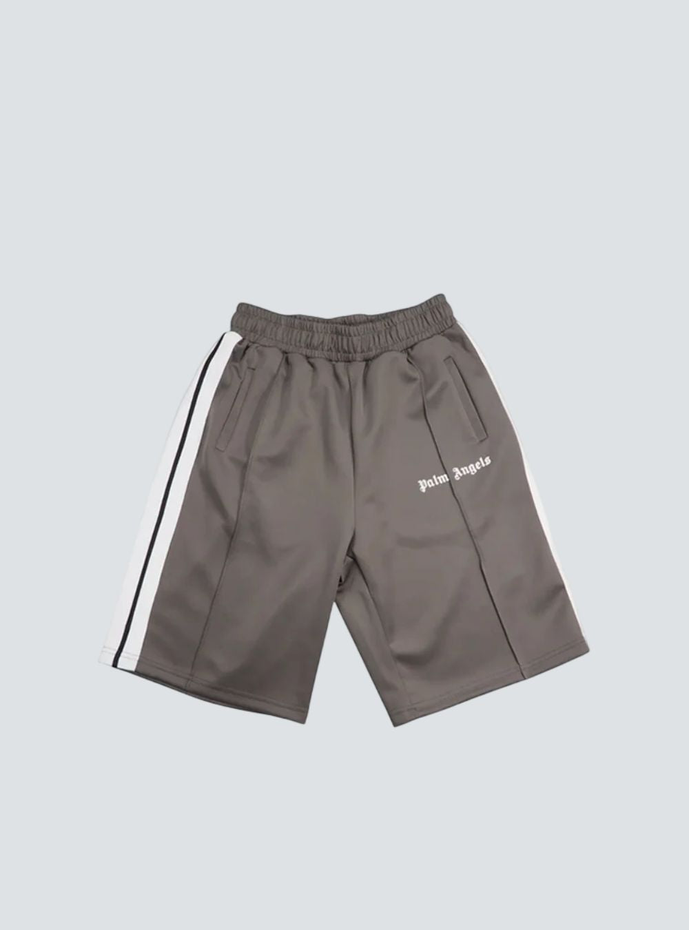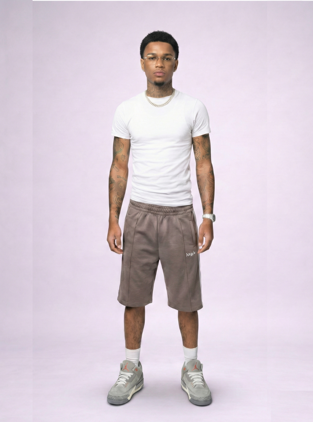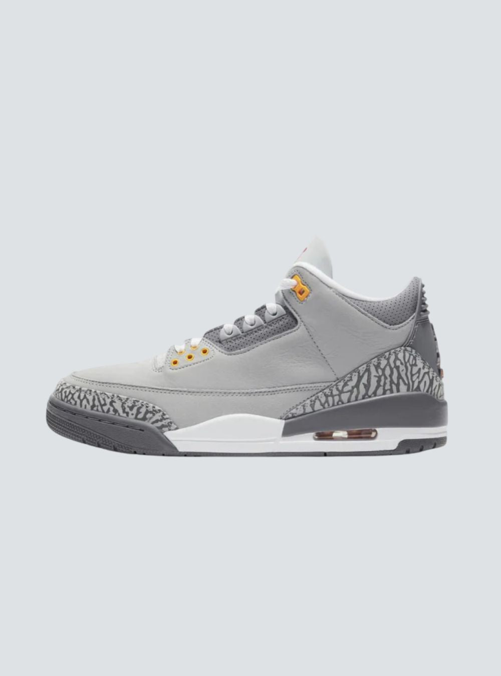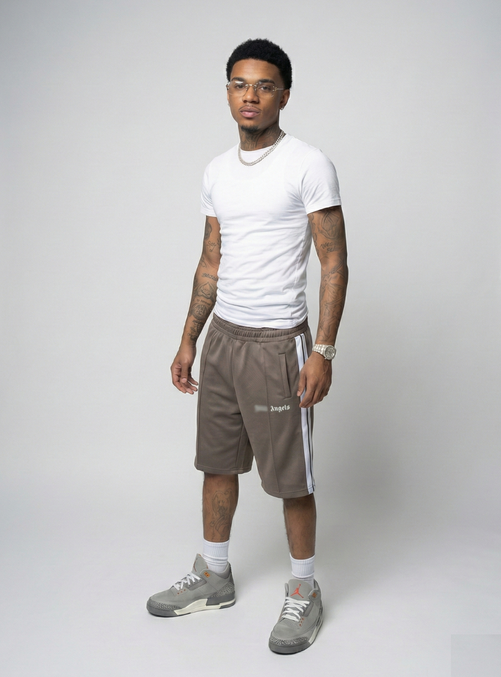 Jordan 3 Cement Grey trazendo presença, camisa branca de algodão para equilíbrio e shorts Palm Angels cinza finalizando com atitude sutil.