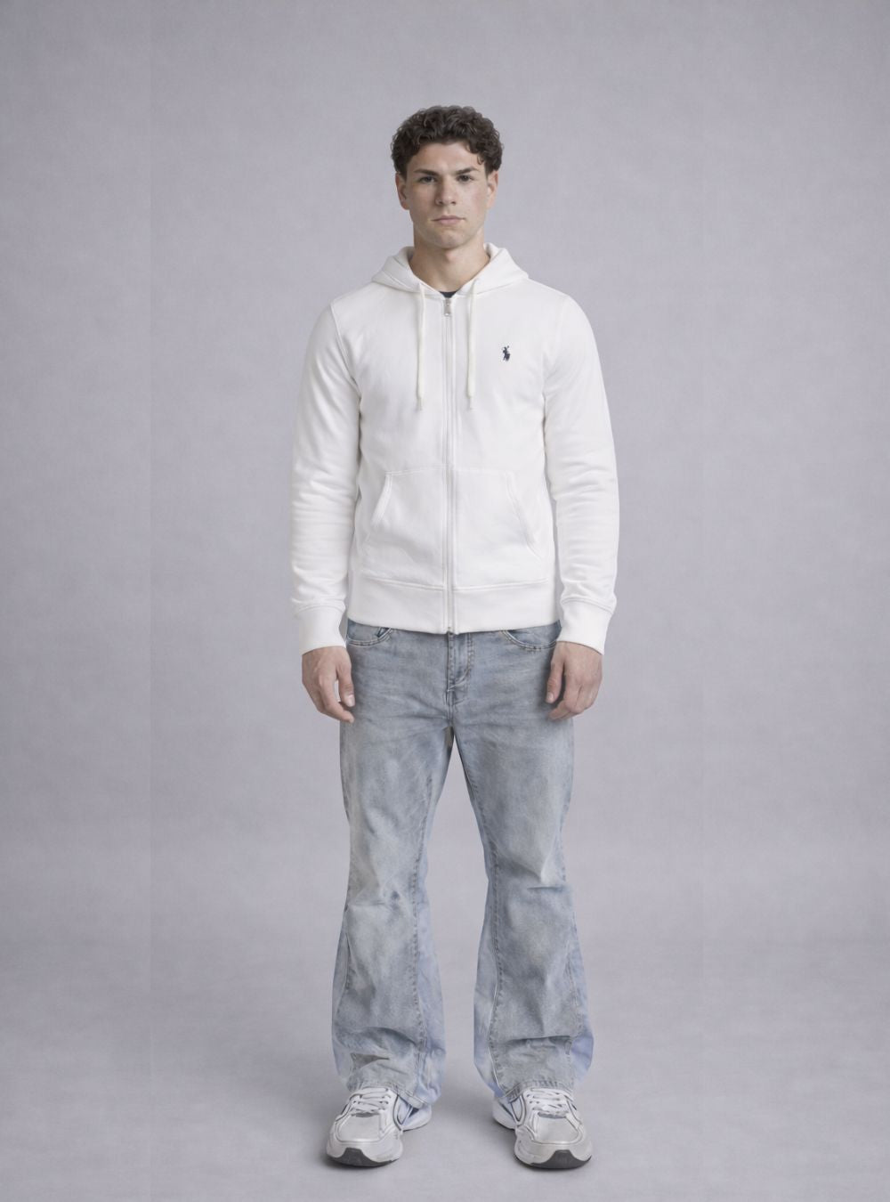 O Dior B30 Countdown Grey dita o ritmo com design esportivo e sofisticado. A Gallery Dept flared adiciona personalidade e movimento, equilibrando proporção e atitude. O moletom Polo Ralph Lauren em branco e cinza concrete finaliza com conforto premium e visual limpo.